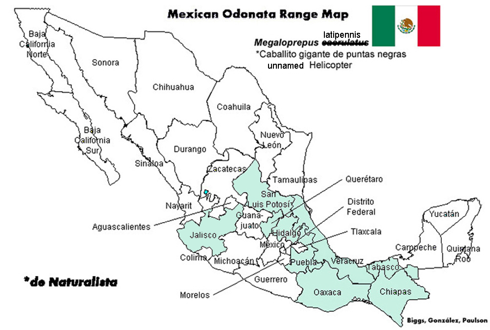 Mexican Blue-winged Helicopter (Megaloprepus latipennis) ![]() ![]() photos: males size: length, VERY LONG/SLENDER 71-115 mm male: very long dark abdomens; long wings end in a black band with 2 white areas at tips female: like male behavior: when flying, only the wingtips show, making it look like a twinkling light in the jungle; hang perch; prey on spiders in their webs; females lay their eggs in puddles formed in tree holes habitat: areas with light gaps in jungle known Jalisco flight months: tbd no Jalisco distribution map Mexican distribution map | |