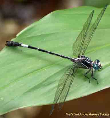 photos: male and scanned male (dead) with appendages enlarged RARE in Jalisco - please report any sightings size: medium, length 49-53 mm, wingspan ~70 mm male: blue eyes; apple to blue-green thorax with wide black 'shoulder' stripe; abdomen dark with green arrow-like marks atop S1-5, S6 with a green ring, S-9 dark on top, S10 yellow; thick bristles on upper last half of the cerci is characteristic (need to have in-hand) female: coloration as in male, but with pale areas on abdomen and legs more extensive similar species: Plateau Ringtail's cerci lack the bristles habitat: moving water known flight months this region: 7 thus far habitat: moving water known flight months this region: 7 thus far distribution this region: Jalisco Mexican distribution map |
