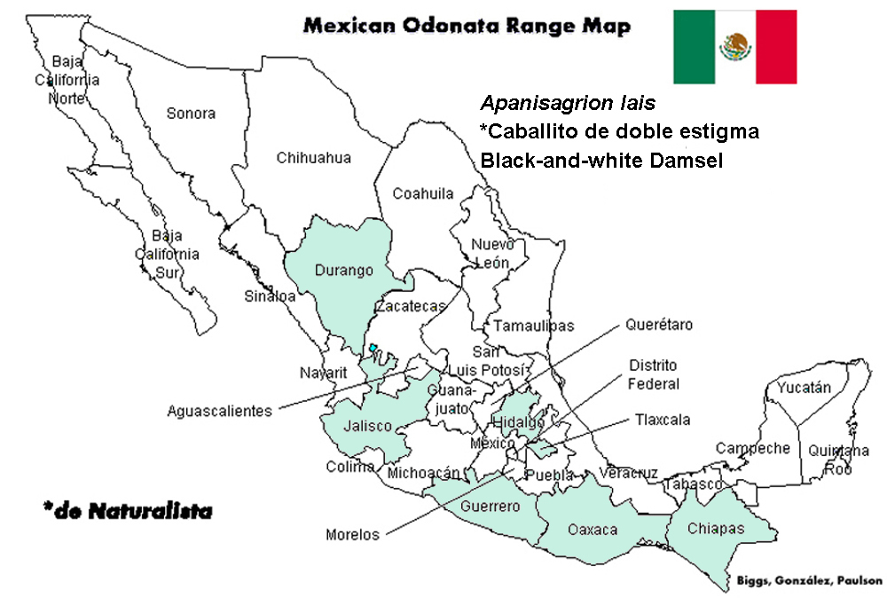 Photos: males & female drawing RARE in Nayarit and Jalisco, please report all sightings size: medium, length 33.6-35.7 mm male: bright sky blue species with very little black; ALL the abdominal segments are blue on the top; side stripe pinched but not forked; top stripe is narrow; S2 has short dark stripe on the side; appendages black female: blue coloration is duller, shows triangles alongside abdomen similar species: Cerulean Dancer has wider top stripe; Sierra Madre Dancer shows black between S7&8 and top stripe is wide habitat: forested areas at waterfalls flight months known in Jalisco/Nayarit: 6, 7, 11 thus far Jalisco/Nayarit distribution: Nayarit and Jalisco Mexican distribution map | |