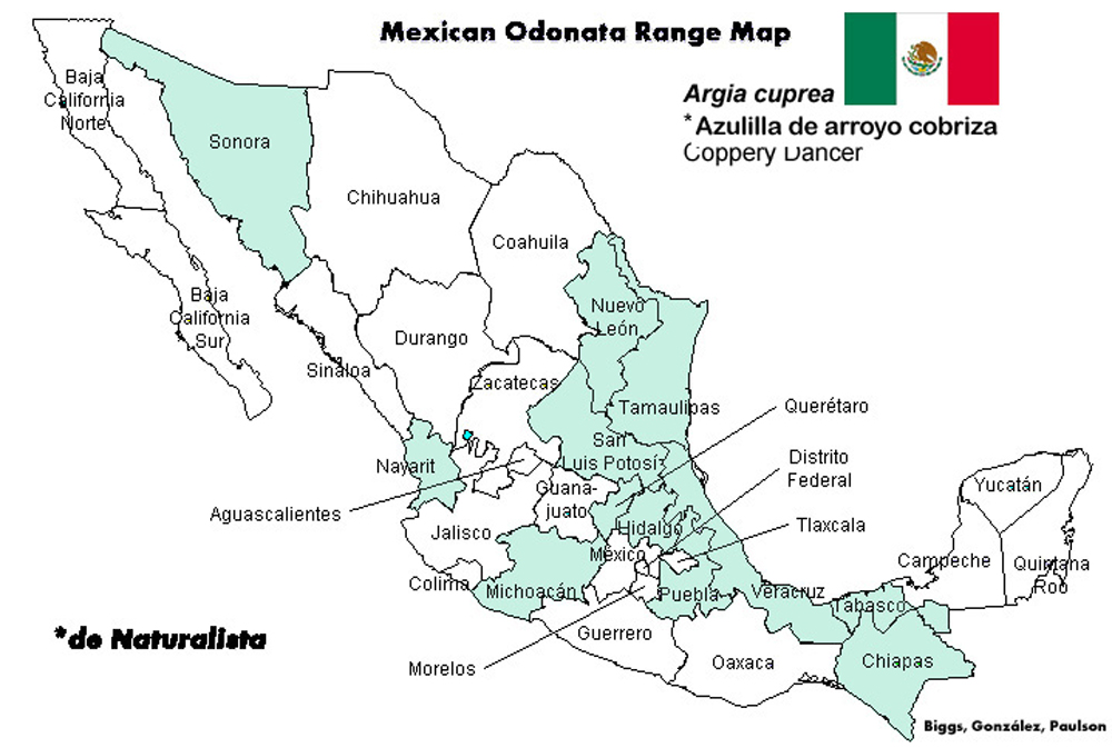 photos: male and tandem ovipositing pair size: small/medium, length 29-40 mm male: upper & front of eyes bright red; coppery orange face; top of thorax dark metallic coppery red; abdomen S3-6 blue/purple above with S8-10 all blue; wings clear female: eye color more muted if showing any red at all; tan/brown coloration; top of thorax without red; deeply forked side thoracic marks similar species: Coppery Dancer (Argia cuprea) [below] has mostly black abdomen with a blue tip behavior: Dancers hold their wings closed, above the body when perched, often clapping them together; females may oviposit completely submerged habitat: shallow rocky streams and rivers flight months known in Jalisco/Nayarit: flies all year Jalisco/Nayarit distribution: Nayarit and Jalisco Mexican distribution map | |
