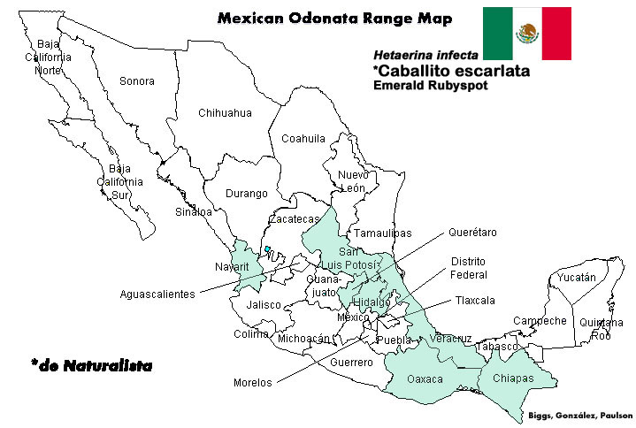 photos: males (close-up & appendages) and female size: medium, length 41-48 mm male: has red at base of wing which is also dark at the tip, there is NO stigma; the bright green triangle on the side of the thorax is diagnostic female: less colorful; wings without red, only amber wash and not dark at tip; green triangle and stripe on thorax side and top habitat: not found at lower elevations flight months known in Jalisco/Nayarit: 1-4, 7-11 thus far Jalisco/Nayarit distribution: Nayarit and Jalisco Mexican distribution map | |