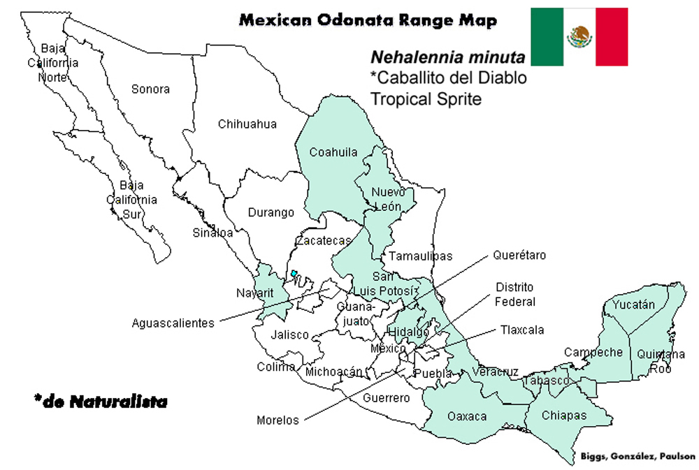 Tropical Sprite (Nehalennia minuta) photos: RARE in Nayarit - please report any sightings size: small, slender ~26 mm male: black bar across head; wide black top stripe with blue thorax sides, sometimes with a dusky spot in the middle of a wide dark side stripe; dark abdomen with S8-10 blue and S8 having a dark wedge pointing towards the head female: like the male habitat: marshy ponds flight months known in Jalisco/Nayarit: TBD Jalisco/Nayarit distribution: Nayarit Mexican distribution map | |