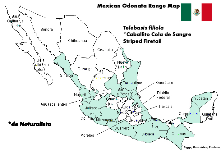 photos: mature male, immatures and female; RARE in Jalisco - please report any sightings size: medium but thin and long, length ~33 mm male: when mature, thin green stripes on thorax, legs without black bands; abdomen red, green and dark with red tip S8-10 female: change greatly as they age, if they live long enough, they are male-like; large ovipositor habitat: presumably swamps flight months known in Jalisco/Nayarit: 7-10 Jalisco/Nayarit distribution: Jalisco and Nayarit Mexican distribution map | |